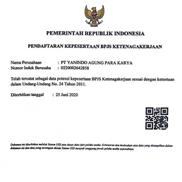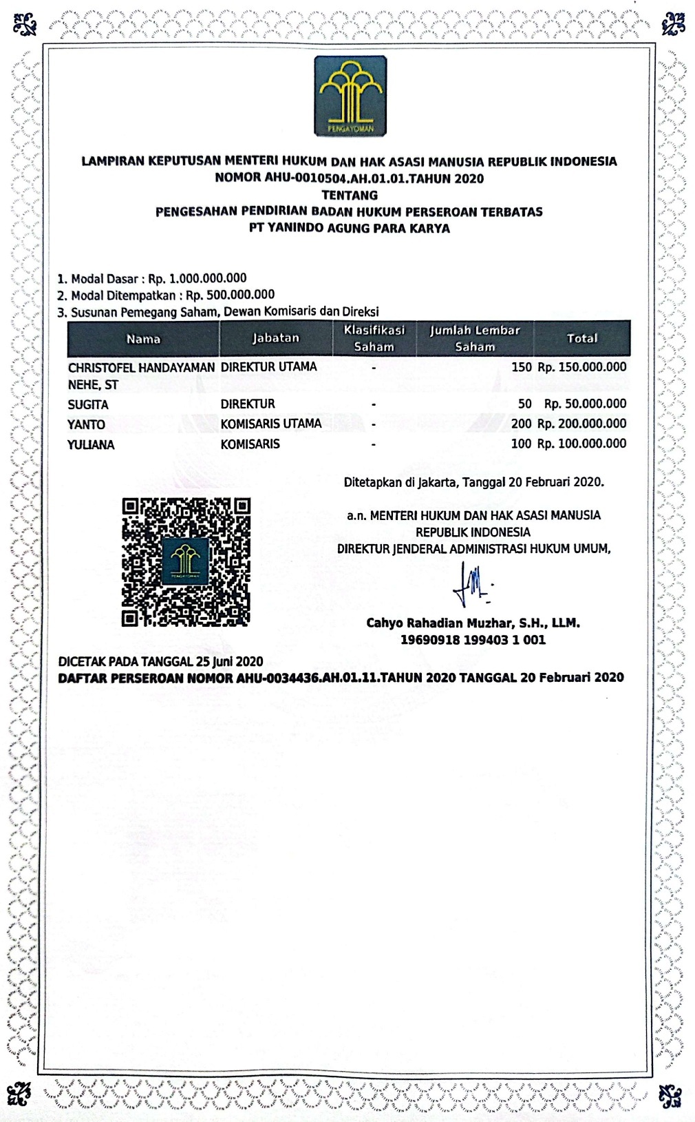 Kami PT. YANINDO AGUNG PARA KARYA merupakan sebuah perusahaan yang berdiri pada tanggal 3 Desember 2019 dihadapan Notaris Gordon Eliwon Harianja, S. H. dengan bentuk Perseroan Terbatas.